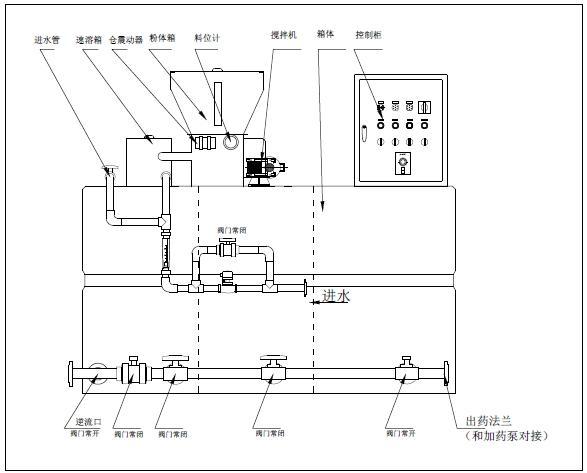 配制溶液從配制槽經熟化槽再進入儲存槽,當儲存槽液位處于高位時,配置過程自動停止,加藥液過程繼續(xù),當溶液下降到中液位時,重新自動啟動配料過程。配制槽和熟化槽均設置攪拌器,充分保證絮凝劑的稀釋和熟化。另外,儲存槽溶液不足時會觸及下液位報警系統(tǒng),所有系統(tǒng)均停止并報警。本裝置是由具有自動化程度高、性能穩(wěn)定、工作可靠、操作簡單等特點。